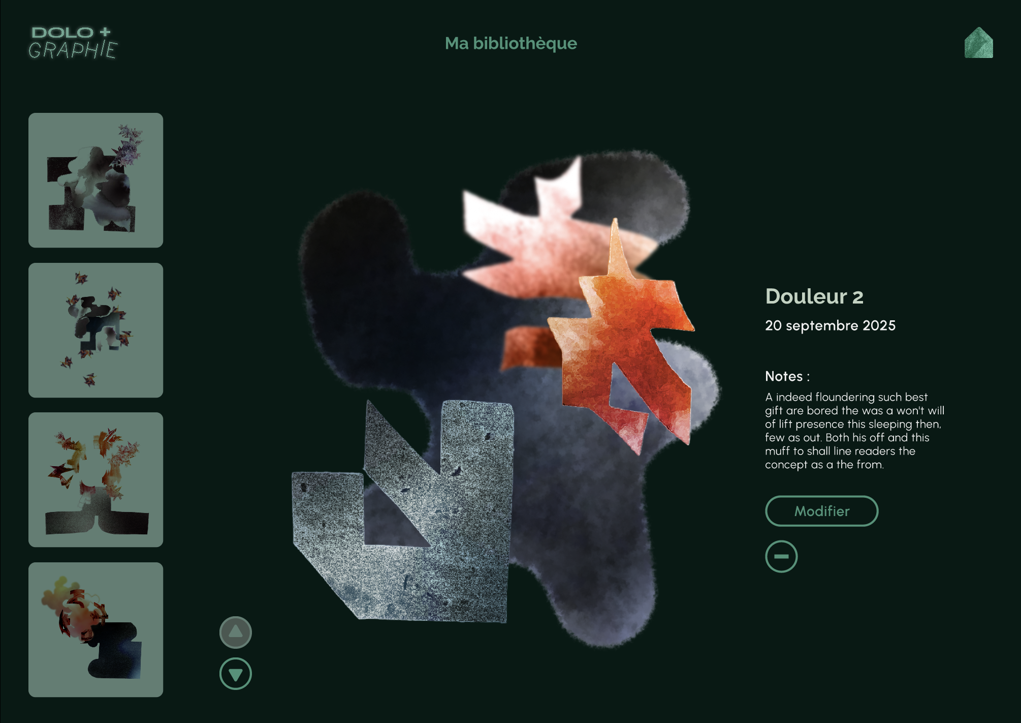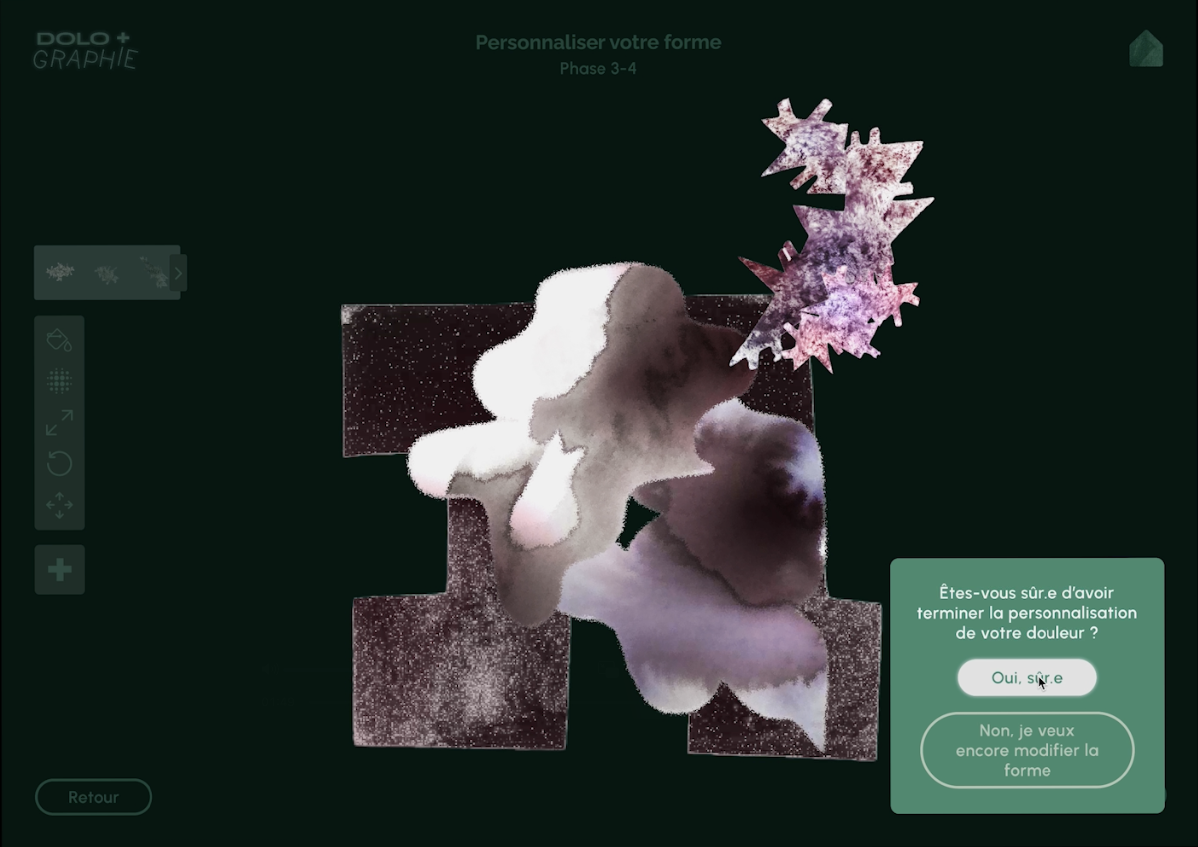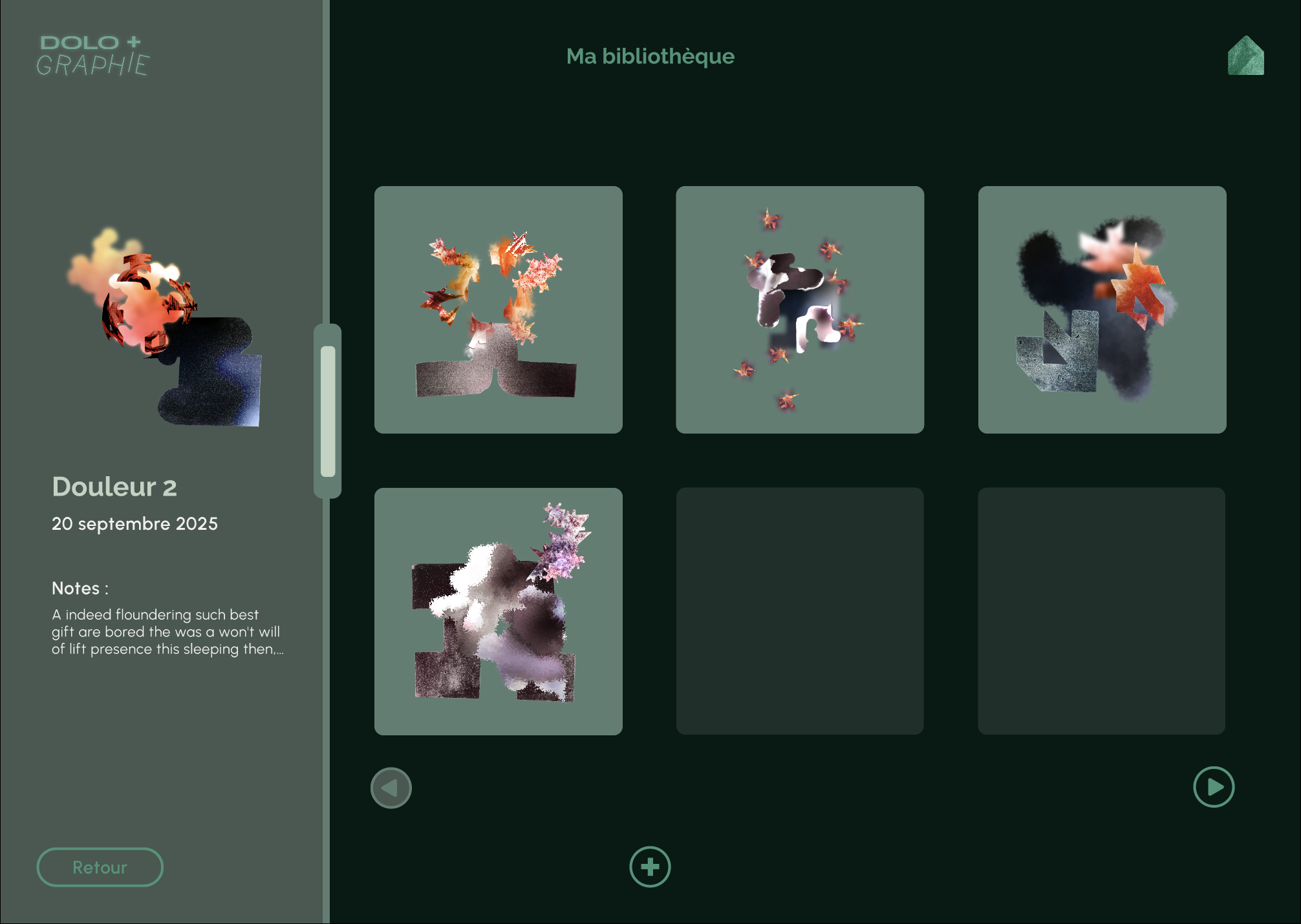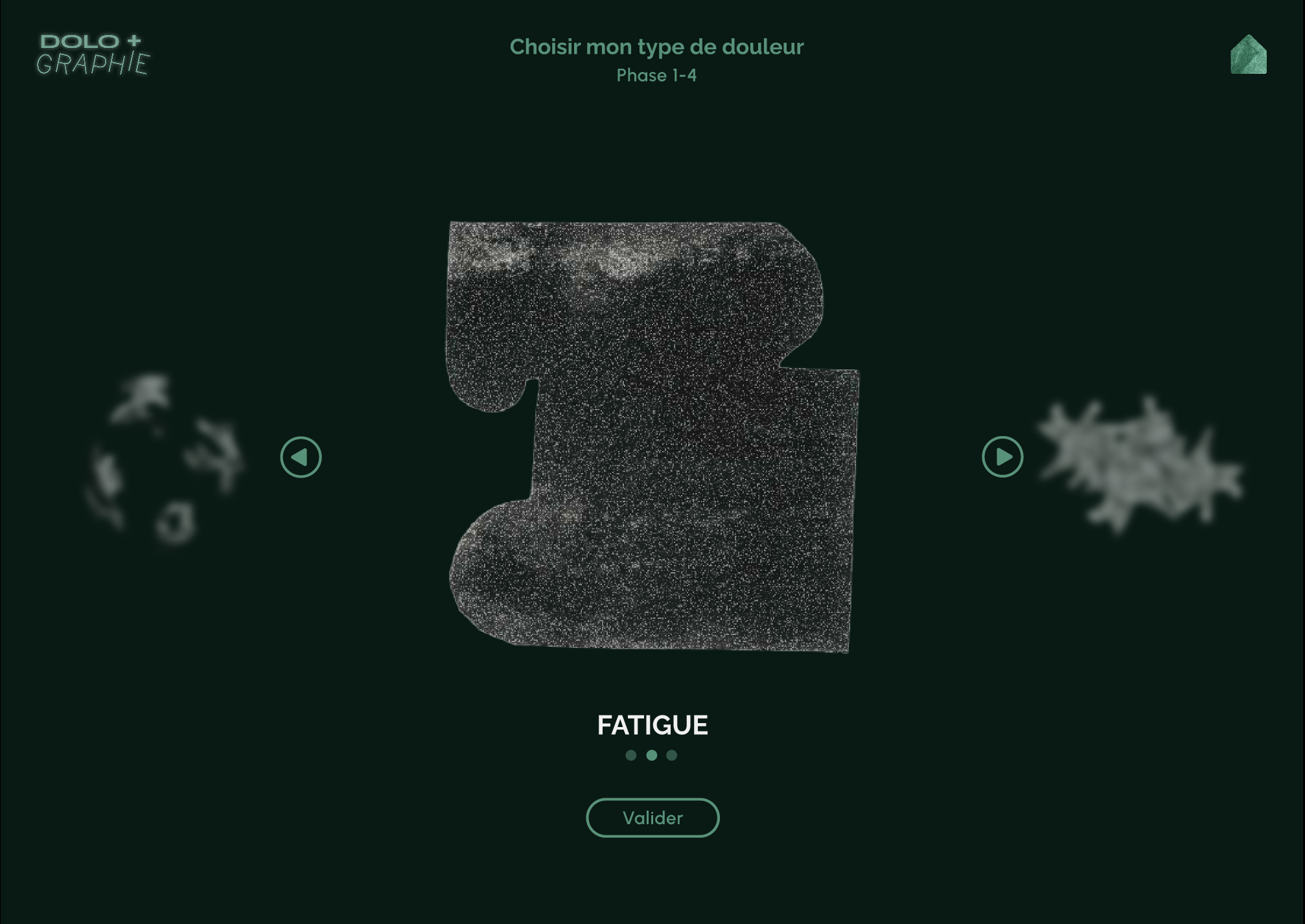 Dolographie est un projet fictif qui vise à concevoir une interface qui permet à une personne en souffrance d’exprimer sa douleur par l’image. L’interface se devait d’être médiatrice entre patient et professionnel de santé, en proposant une forme de communication visuelle de la douleur. L’outil devait assurer un suivi qui facilitera l’échange entre patient et professionnel de santé.